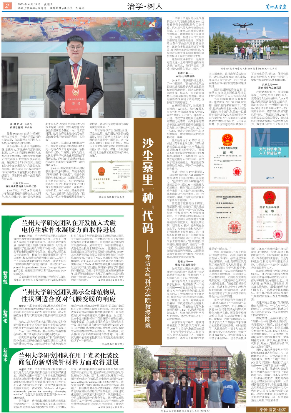 From sketching the first sandstorm transport path map by hand to solving aerosol research bottlenecks with AI algorithms; from collecting samples in northern deserts during his student days under mentorship to now leading the development of an AI-driven atmospheric aerosol inversion system, over two decades, Chen Bin has gradually unveiled the complex veil of atmospheric aerosols in the Loess Plateau's deserts. Standing before his self-authored book "Artificial Intelligence Technologies in Atmospheric Science," Chen firmly believes northwest China can equally produce outstanding scientific achievements.