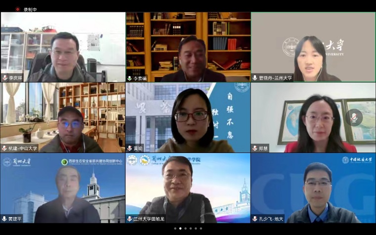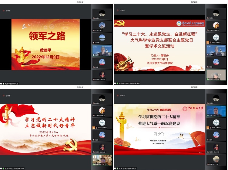 On December 9, the theme party day and academic exchange activity was carried out by the teaching and working party branch of the College of Atmospheric Sciences of Lanzhou University to thoroughly study and implement the spirit of the Twentieth National Congress of the Communist Party of China, further carry forward the spirit of patriotism and the spirit of scientists, improve the organizational strength, cohesion and combat effectiveness of the teaching and working party branch, enhance the party spirit cultivation and professional quality of young teachers, promote cooperation and exchanges between teaching and working party branches of the same specialty in colleges and universities, and strive to build a new pattern of grass-roots party building. It was jointly organized with by the Teaching Party Branch of the Department of Marine Meteorology (Cryosphere Science) at the School of Atmospheric Science, Sun Yat sen University, and the Teaching Party Branch of the Department of Atmospheric Science at the School of Environment, China University of Geosciences (Wuhan). Professor Huang Jianping, academician of the CAS Member and director of the Western Ecological Security Collaborative Innovation Center of Lanzhou University, Zheng Hui, secretary of the Party Committee of the School of Atmospheric Sciences of Sun Yat sen University, Hang Jian, vice president, Li Qingxiang, secretary of the Party branch of the Department of Marine Meteorology (Cryospheric Science), Li Sukuang, secretary of the Party committee of the School of Environment of China University of Geosciences (Wuhan), Kong Shaofei, secretary of the Party branch of the Department of Atmospheric Sciences, Tian Xulong, secretary of the Party committee of the College of Atmospheric Sciences of Lanzhou University , Guan Xiaodan, secretary of the Party branch of the Department of climatology, and all members of the three branches attended the meeting. The meeting was chaired by Huang Yu, Deputy Secretary of the Party Committee of the College of Atmospheric Sciences at Lanzhou University.